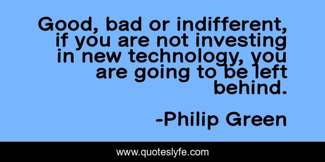 This page presents the quote "Good, bad or indifferent, if you are not investing in new technology, you are going to be left behind.". Author of this quote is Philip Green. This quote is about new, technology,.