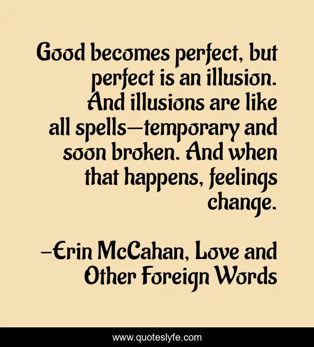 This page presents the quote "Good becomes perfect, but perfect is an illusion. And illusions are like all spells—temporary and soon broken. And when that happens, feelings change.". Author of this quote is Erin McCahan, Love and Other Foreign Words. This quote is about love, illusion, affection, feelings,.