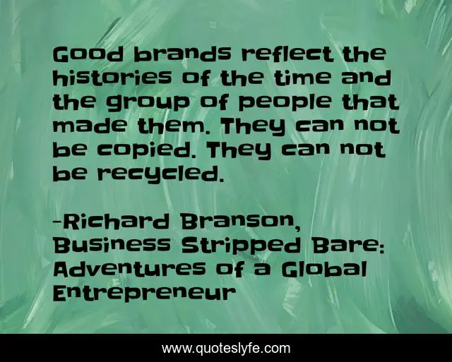 This page presents the quote "Good brands reflect the histories of the time and the group of people that made them. They can not be copied. They can not be recycled.". Author of this quote is Richard Branson, Business Stripped Bare: Adventures of a Global Entrepreneur. .