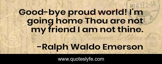 This page presents the quote "Good-bye proud world! I'm going home Thou are not my friend I am not thine.". Author of this quote is Ralph Waldo Emerson. .