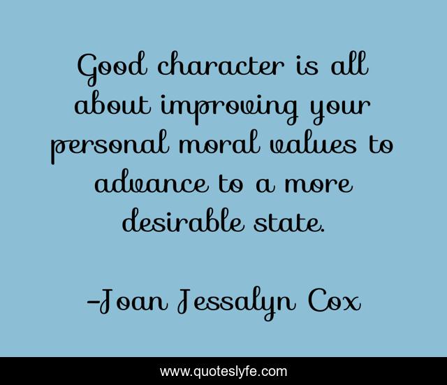 This page presents the quote "Good character is all about improving your personal moral values to advance to a more desirable state.". Author of this quote is Joan Jessalyn Cox. This quote is about christian, conduct, moral-values, inspirational, enthusiasm,.