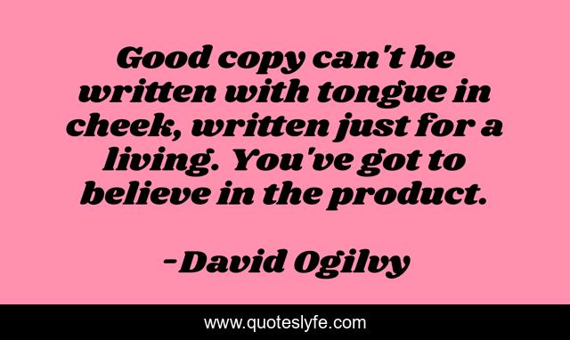 This page presents the quote "Good copy can't be written with tongue in cheek, written just for a living. You've got to believe in the product.". Author of this quote is David Ogilvy. This quote is about living, believe,.