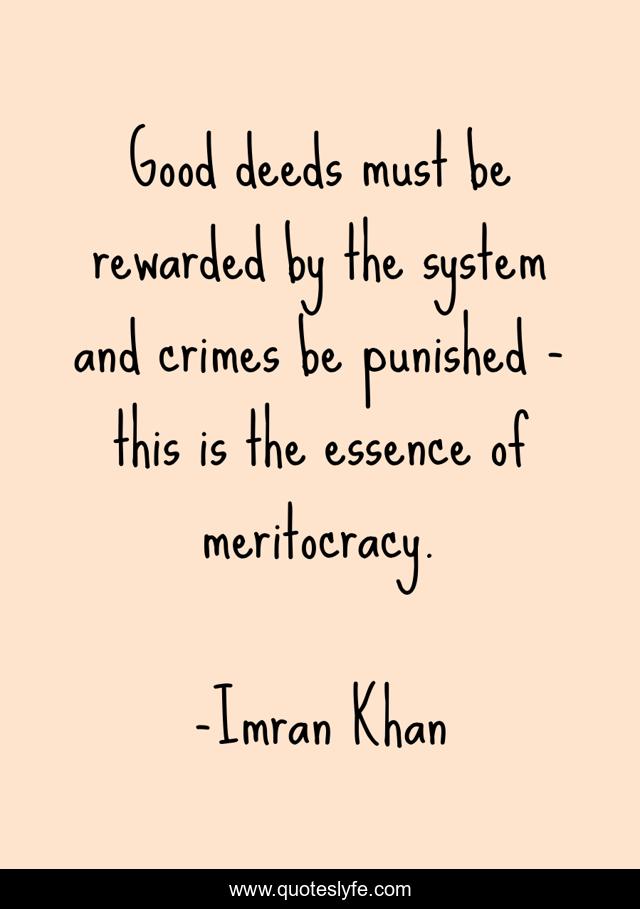 This page presents the quote "Good deeds must be rewarded by the system and crimes be punished - this is the essence of meritocracy.". Author of this quote is Imran Khan. This quote is about systemic-failure, good, deeds,.
