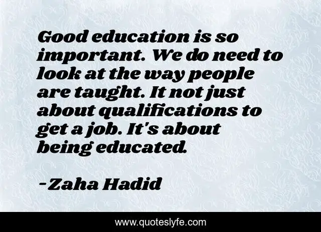 This page presents the quote "Good education is so important. We do need to look at the way people are taught. It not just about qualifications to get a job. It's about being educated.". Author of this quote is Zaha Hadid. This quote is about job, good, people,.