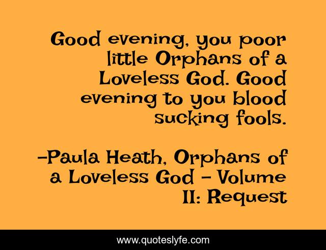 "Paula Heath, Orphans of a Loveless God - Volume II: Request Quotes." Quoteslyfe.com, 2025. Fri. 05 Dec. 2025. <https://www.quoteslyfe.com/quote/Good-evening-you-poor-little-Orphans-of-132287>.