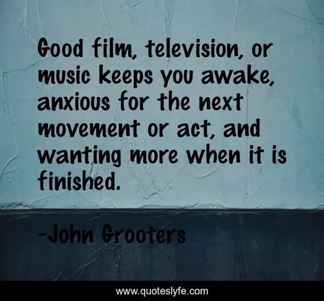 This page presents the quote "Good film, television, or music keeps you awake, anxious for the next movement or act, and wanting more when it is finished.". Author of this quote is John Grooters. This quote is about wanting, television, music, film,.