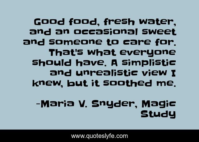 This page presents the quote "Good food, fresh water, and an occasional sweet and someone to care for. That's what everyone should have. A simplistic and unrealistic view I knew, but it soothed me.". Author of this quote is Maria V. Snyder, Magic Study. This quote is about minimalism-essentials, love, food, water, sweets, yelena-zaltana, kiki, affection,.