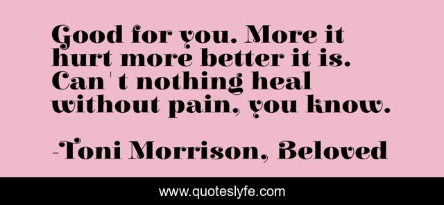 This page presents the quote "Good for you. More it hurt more better it is. Can't nothing heal without pain, you know.". Author of this quote is Toni Morrison, Beloved. This quote is about heal, morrison, pain, beloved, toni-morrison,.