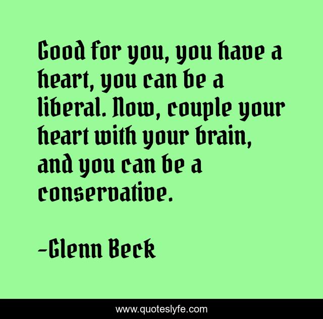 This page presents the quote "Good for you, you have a heart, you can be a liberal. Now, couple your heart with your brain, and you can be a conservative.". Author of this quote is Glenn Beck. This quote is about heart, conservative, liberal, brain,.