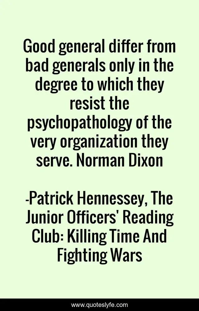 This page presents the quote "Good general differ from bad generals only in the degree to which they resist the psychopathology of the very organization they serve. Norman Dixon". Author of this quote is Patrick Hennessey, The Junior Officers' Reading Club: Killing Time And Fighting Wars. This quote is about bureaucracy, skepticism, leadership,.