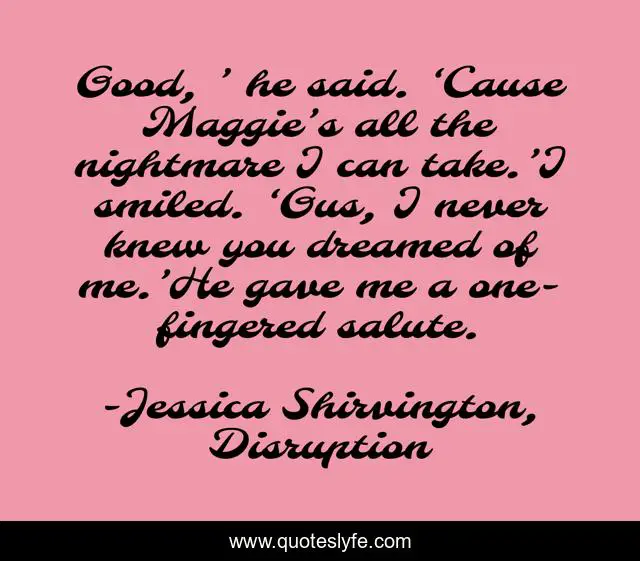 This page presents the quote "Good, ’ he said. ‘Cause Maggie’s all the nightmare I can take.’I smiled. ‘Gus, I never knew you dreamed of me.’He gave me a one-fingered salute.". Author of this quote is Jessica Shirvington, Disruption. This quote is about gus, maggie, witty, humor,.