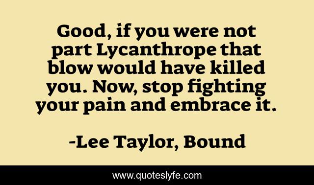 This page presents the quote "Good, if you were not part Lycanthrope that blow would have killed you. Now, stop fighting your pain and embrace it.". Author of this quote is Lee Taylor, Bound. This quote is about ursine, fantasy, unleashed, bound,.