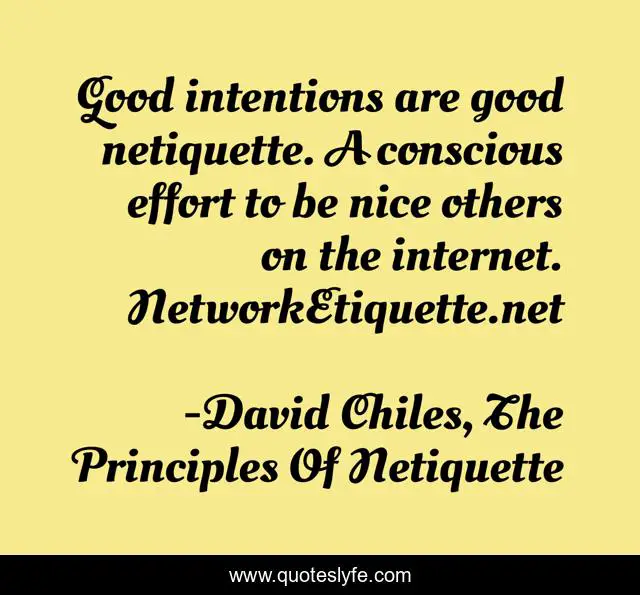 "David Chiles, The Principles Of Netiquette Quotes." Quoteslyfe.com, 2025. Mon. 08 Dec. 2025. <https://www.quoteslyfe.com/quote/Good-intentions-are-good-netiquette-A-conscious-205501>.
