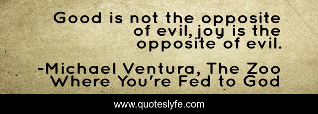 This page presents the quote "Good is not the opposite of evil, joy is the opposite of evil.". Author of this quote is Michael Ventura, The Zoo Where You're Fed to God. This quote is about joy, good, evil,.
