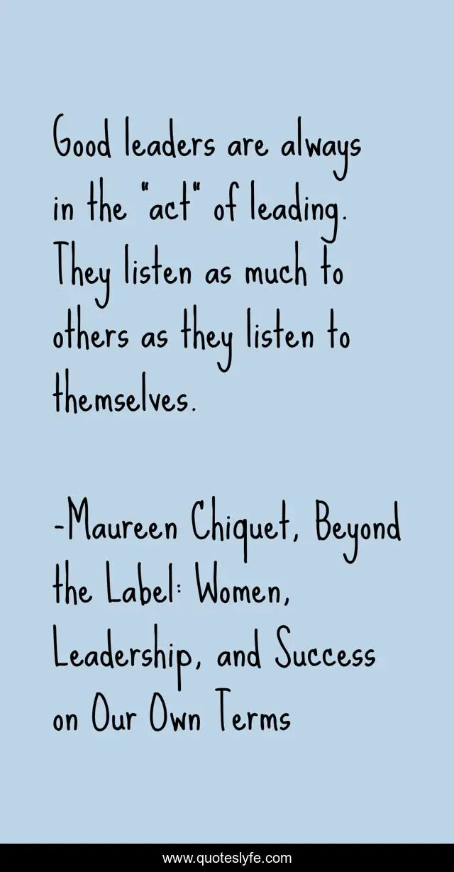 This page presents the quote "Good leaders are always in the “act” of leading. They listen as much to others as they listen to themselves.". Author of this quote is Maureen Chiquet, Beyond the Label: Women, Leadership, and Success on Our Own Terms. This quote is about leadership, women-s-inspirational, good-leadership, leadership-development,.