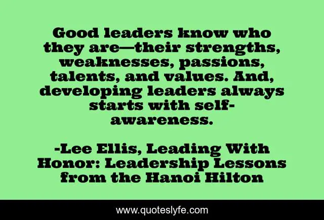 This page presents the quote "Good leaders know who they are—their strengths, weaknesses, passions, talents, and values. And, developing leaders always starts with self-awareness.". Author of this quote is Lee Ellis, Leading With Honor: Leadership Lessons from the Hanoi Hilton. This quote is about military, leadership, business,.