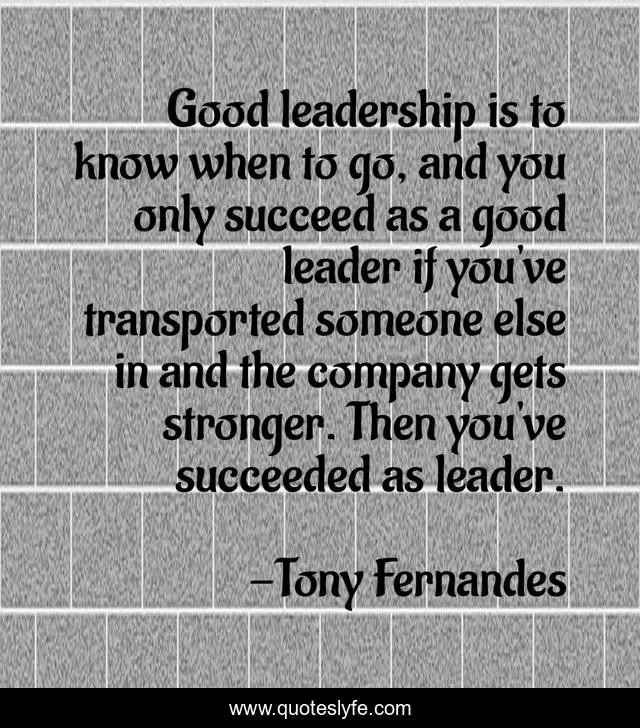 This page presents the quote "Good leadership is to know when to go, and you only succeed as a good leader if you've transported someone else in and the company gets stronger. Then you've succeeded as leader.". Author of this quote is Tony Fernandes. This quote is about company, good, leader,.