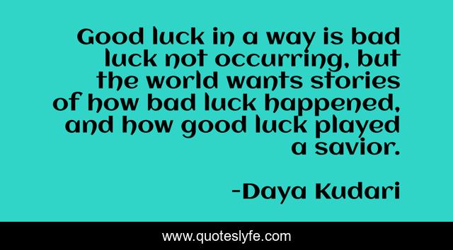 This page presents the quote "Good luck in a way is bad luck not occurring, but the world wants stories of how bad luck happened, and how good luck played a savior.". Author of this quote is Daya Kudari. This quote is about life, opportunity, luck,.
