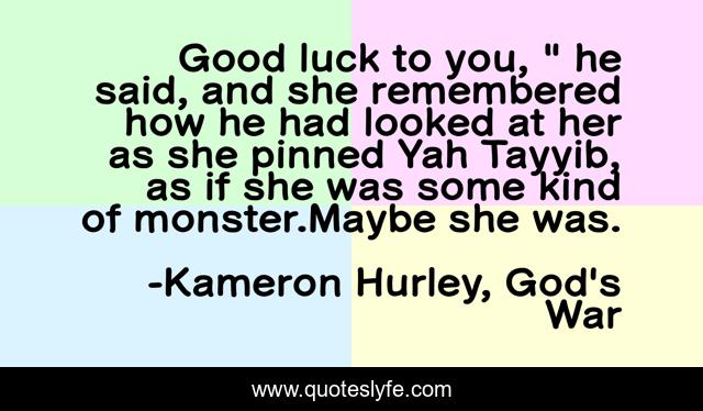 This page presents the quote "Good luck to you, " he said, and she remembered how he had looked at her as she pinned Yah Tayyib, as if she was some kind of monster.Maybe she was.". Author of this quote is Kameron Hurley, God's War. .