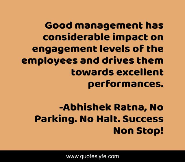 This page presents the quote "Good management has considerable impact on engagement levels of the employees and drives them towards excellent performances.". Author of this quote is Abhishek Ratna, No Parking. No Halt. Success Non Stop!. This quote is about management, leadership-development, management-and-leadership, manager-qualities, manager, leadership-training,.