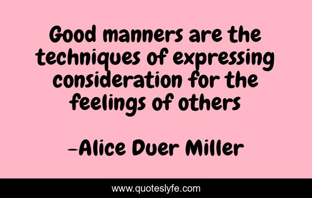 "Alice Duer Miller Quotes." Quoteslyfe.com, 2025. Sun. 14 Dec. 2025. <https://www.quoteslyfe.com/quote/Good-manners-are-the-techniques-of-expressing-267951>.
