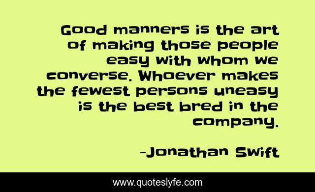 This page presents the quote "Good manners is the art of making those people easy with whom we converse. Whoever makes the fewest persons uneasy is the best bred in the company.". Author of this quote is Jonathan Swift. .