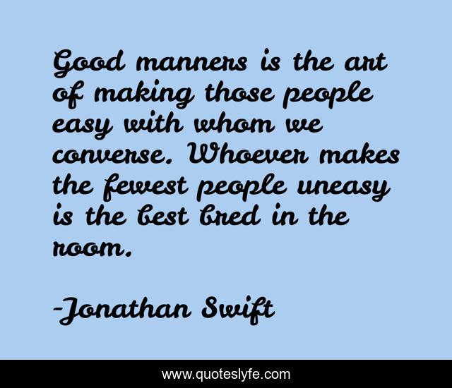This page presents the quote "Good manners is the art of making those people easy with whom we converse. Whoever makes the fewest people uneasy is the best bred in the room.". Author of this quote is Jonathan Swift. This quote is about good, best, people,.