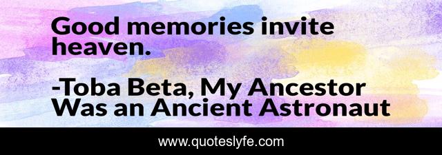 This page presents the quote "Good memories invite heaven.". Author of this quote is Toba Beta, My Ancestor Was an Ancient Astronaut. This quote is about memories, heaven, memory,.