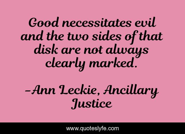 This page presents the quote "Good necessitates evil and the two sides of that disk are not always clearly marked.". Author of this quote is Ann Leckie, Ancillary Justice. This quote is about yin-yang, good-and-evil,.