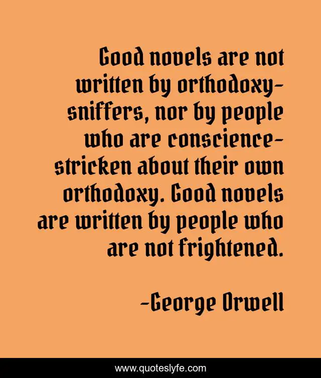 This page presents the quote "Good novels are not written by orthodoxy-sniffers, nor by people who are conscience-stricken about their own orthodoxy. Good novels are written by people who are not frightened.". Author of this quote is George Orwell. .