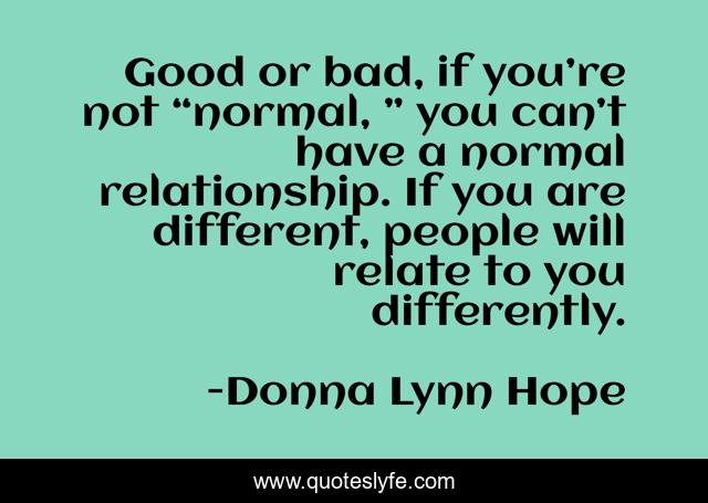 This page presents the quote "Good or bad, if you’re not “normal, ” you can’t have a normal relationship. If you are different, people will relate to you differently.". Author of this quote is Donna Lynn Hope. This quote is about different, differences, unique, one-of-a-kind,.