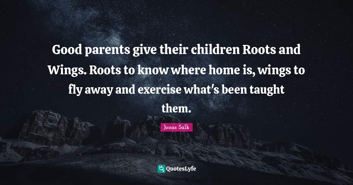 This page presents the quote "Good parents give their children Roots and Wings. Roots to know where home is, wings to fly away and exercise what's been taught them.". Author of this quote is Jonas Salk. This quote is about fly away, family, exercise, inspirational, children, roots, taught, wings, home,.