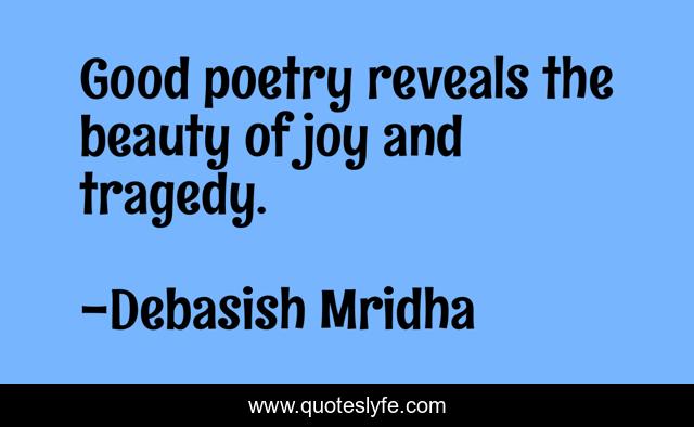 This page presents the quote "Good poetry reveals the beauty of joy and tragedy.". Author of this quote is Debasish Mridha. This quote is about reveal, life, philosophy, beauty, joy, debasish, poetry, writing, mridha,.