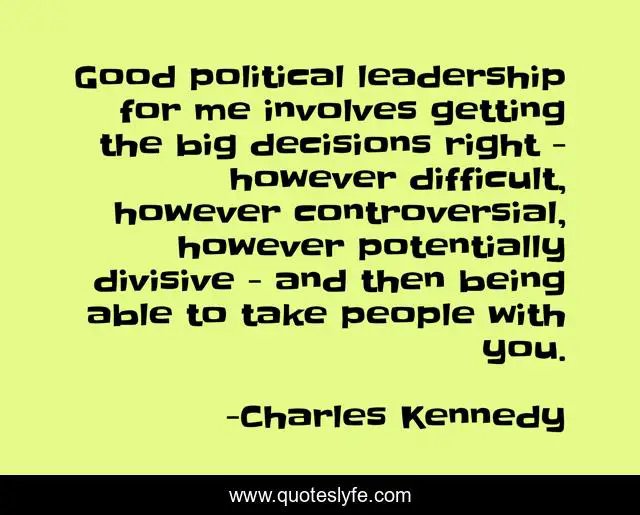 This page presents the quote "Good political leadership for me involves getting the big decisions right - however difficult, however controversial, however potentially divisive - and then being able to take people with you.". Author of this quote is Charles Kennedy. This quote is about me, good, decisions,.