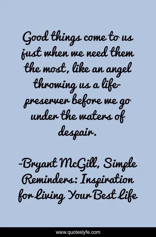 This page presents the quote "Good things come to us just when we need them the most, like an angel throwing us a life-preserver before we go under the waters of despair.". Author of this quote is Bryant McGill, Simple Reminders: Inspiration for Living Your Best Life. This quote is about despair, angelic, goodness, preservation,.