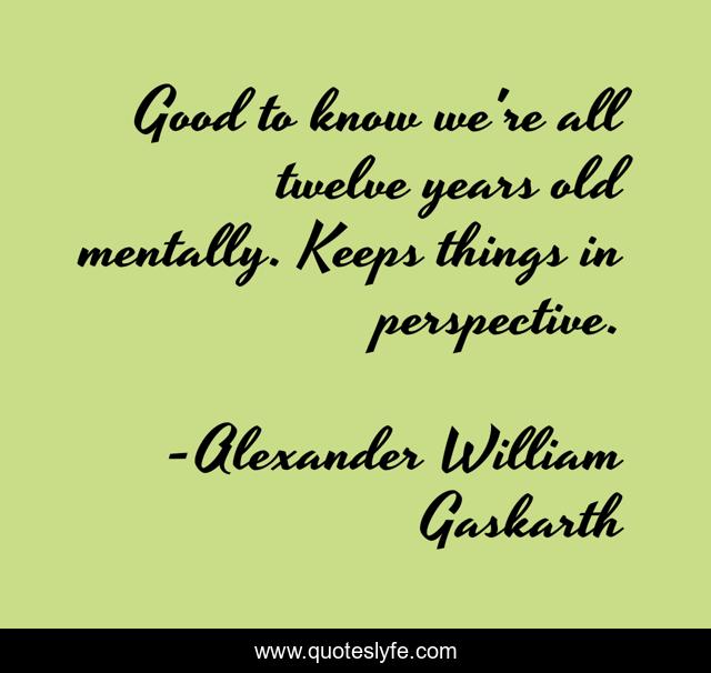 This page presents the quote "Good to know we're all twelve years old mentally. Keeps things in perspective.". Author of this quote is Alexander William Gaskarth. This quote is about all-time-low, mental, brain, mind, young, never-grow-up, thought, maturity, mature,.