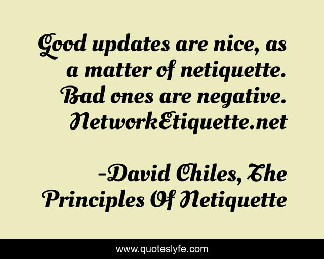 This page presents the quote "Good updates are nice, as a matter of netiquette. Bad ones are negative. NetworkEtiquette.net". Author of this quote is David Chiles, The Principles Of Netiquette. This quote is about blog, social-media, social-network, rules-for-netiquette, internet-etiquette, netiquette-rules, netiquette, facebook, good-reads,.