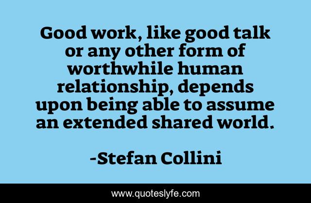 This page presents the quote "Good work, like good talk or any other form of worthwhile human relationship, depends upon being able to assume an extended shared world.". Author of this quote is Stefan Collini. This quote is about education-system, education, humanities,.