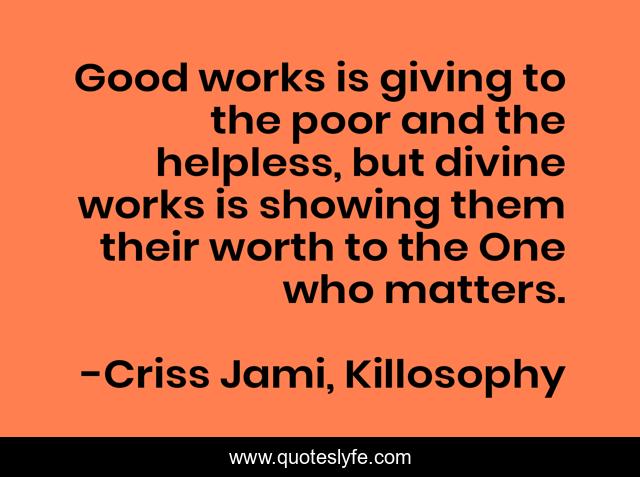 "Criss Jami, Killosophy Quotes." Quoteslyfe.com, 2025. Fri. 05 Dec. 2025. <https://www.quoteslyfe.com/quote/Good-works-is-giving-to-the-poor-2706>.