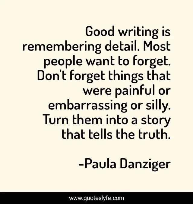 This page presents the quote "Good writing is remembering detail. Most people want to forget. Don't forget things that were painful or embarrassing or silly. Turn them into a story that tells the truth.". Author of this quote is Paula Danziger. This quote is about story, pain, forget, writer, detail, writing, write, silly, truth,.