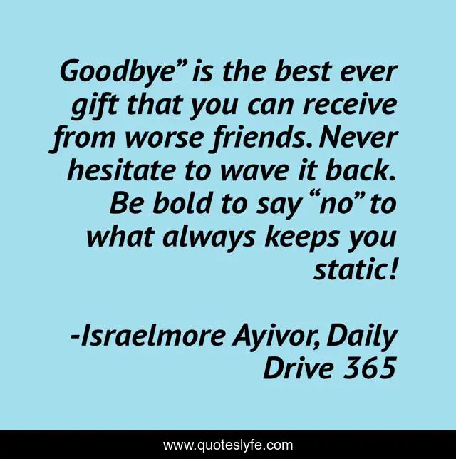 This page presents the quote "Goodbye” is the best ever gift that you can receive from worse friends. Never hesitate to wave it back. Be bold to say “no” to what always keeps you static!". Author of this quote is Israelmore Ayivor, Daily Drive 365. This quote is about food-for-thought, bold, gift, negative-people, be-bold, just-say-no, bad-friends, wave, toxic-people,.