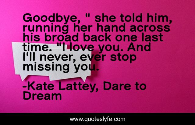 This page presents the quote "Goodbye, " she told him, running her hand across his broad back one last time. "I love you. And I'll never, ever stop missing you.". Author of this quote is Kate Lattey, Dare to Dream. This quote is about grief, loss, goodbye,.