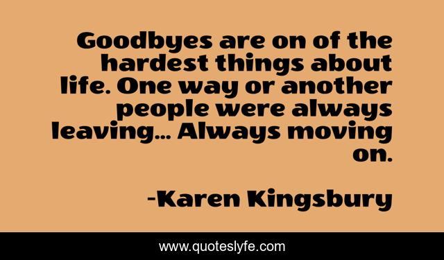 This page presents the quote "Goodbyes are on of the hardest things about life. One way or another people were always leaving... Always moving on.". Author of this quote is Karen Kingsbury. This quote is about goodbyes, life, leaving, people,.