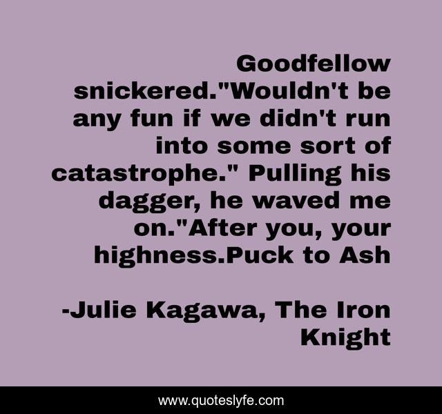 This page presents the quote "Goodfellow snickered."Wouldn't be any fun if we didn't run into some sort of catastrophe." Pulling his dagger, he waved me on."After you, your highness.Puck to Ash". Author of this quote is Julie Kagawa, The Iron Knight. This quote is about funny, puck, comedy, ash,.