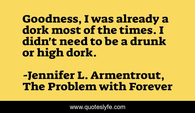 This page presents the quote "Goodness, I was already a dork most of the times. I didn't need to be a drunk or high dork.". Author of this quote is Jennifer L. Armentrout, The Problem with Forever. This quote is about drugs, drinking, dork, self-deprecation,.