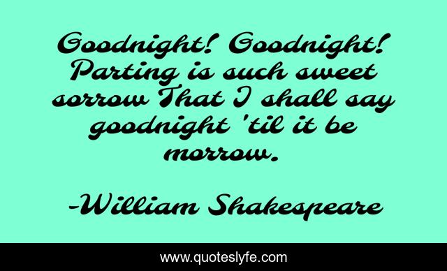 This page presents the quote "Goodnight! Goodnight! Parting is such sweet sorrow That I shall say goodnight 'til it be morrow.". Author of this quote is William Shakespeare. This quote is about partings, meetings,.