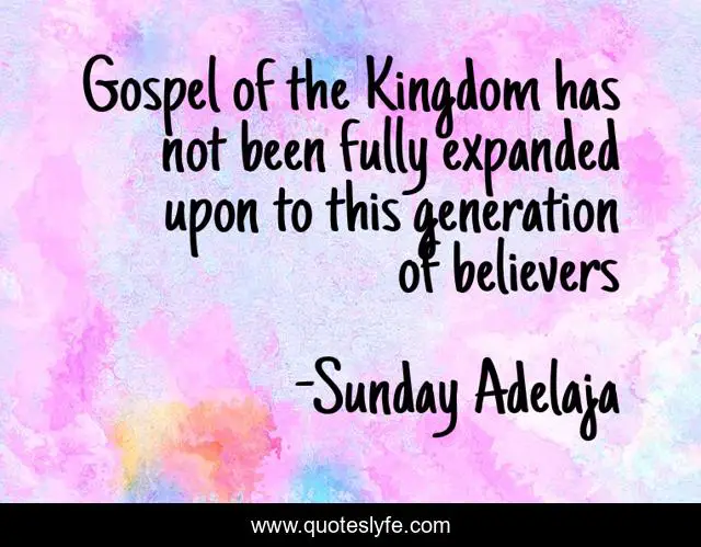 This page presents the quote "Gospel of the Kingdom has not been fully expanded upon to this generation of believers". Author of this quote is Sunday Adelaja. This quote is about kingdom, believers, fully, expanded, generation, gospel, has, notbeen,.
