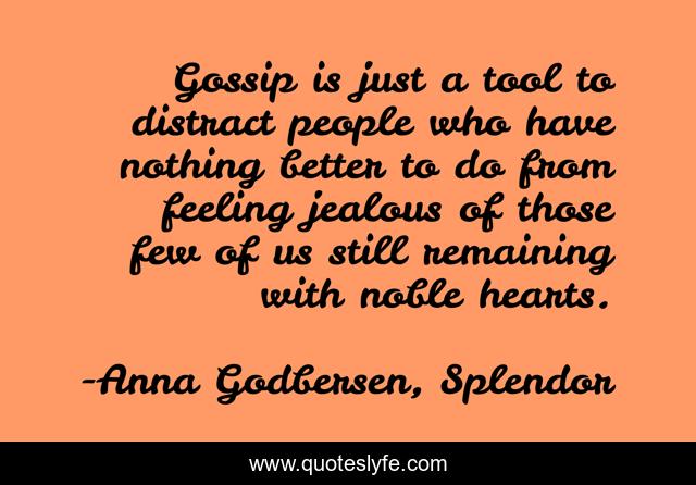 This page presents the quote "Gossip is just a tool to distract people who have nothing better to do from feeling jealous of those few of us still remaining with noble hearts.". Author of this quote is Anna Godbersen, Splendor. This quote is about gossip, humor, jealousy, inspirational, enthusiasm,.