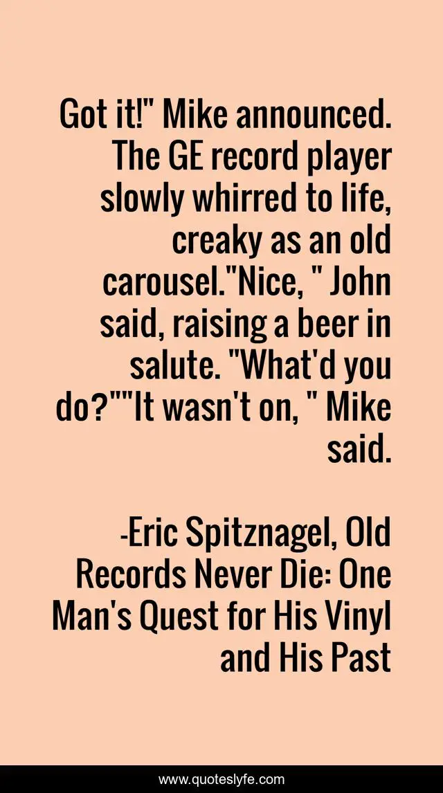 "Eric Spitznagel, Old Records Never Die: One Man's Quest for His Vinyl and His Past Quotes." Quoteslyfe.com, 2025. Fri. 05 Dec. 2025. <https://www.quoteslyfe.com/quote/Got-it-Mike-announced-The-GE-record-79387>.