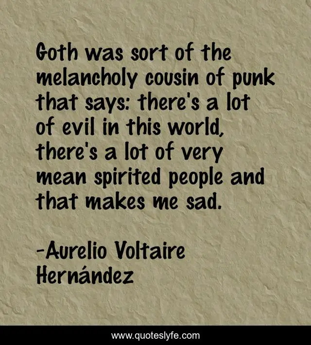 This page presents the quote "Goth was sort of the melancholy cousin of punk that says: there's a lot of evil in this world, there's a lot of very mean spirited people and that makes me sad.". Author of this quote is Aurelio Voltaire Hernández. This quote is about goth, music,.